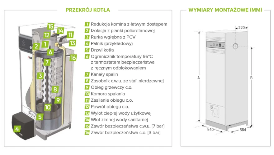 | Wymiary kotła wys x szer x głęb (mm) | 1615 x 540 x 584 |