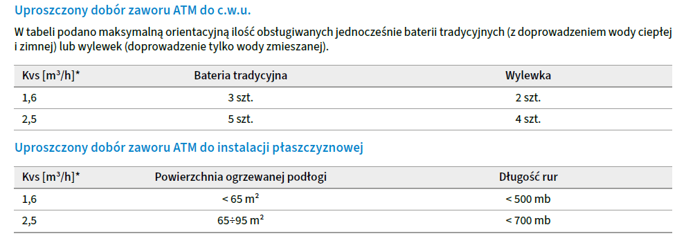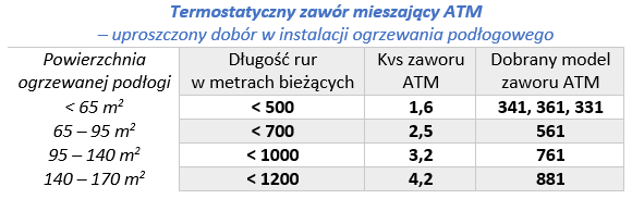 Ze względu na rozmiar dobór termostatycznych zaworów mieszających ATM w instalacji ogrzewania podłogowego powinien zostać poprzedzony stosownymi obliczeniami uwzględniającymi warunki hydrauliczne konkretnej instalacji. Można jednak posłużyć się pewnymi oszacowanymi wartościami wynikającymi z praktyki oraz dużych uproszczeń obliczeń hydraulicznych. Taki dobór określa maksymalne długości rury instalacji podłogowej wyrażonej w metrach bieżących dla jakich możemy zastosować dany zawór. W tabeli poniżej zawarto odpowiednie dla poszczególnych zaworów ATM długości rury instalacyjnej wyrażonej w metrach bieżących oraz powierzchnie ogrzewanej podłogi w metrach kwadratowych.