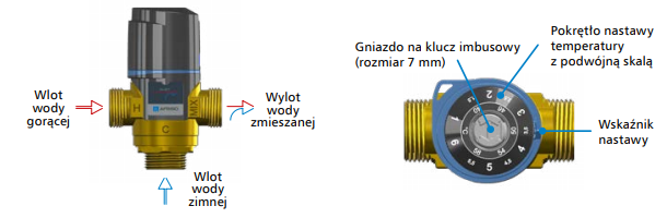 Termostatyczne zawory mieszające ATM posiadają możliwość regulacji temperatury ciepłej wody użytkowej. Dodatkowo wyposażone zostały w funkcję "bez oparzeń". Powoduje ona zablokowanie dopływu wody ciepłej w wypadku awarii dopływu wody zimnej. Do użytku w instalacjach ciepłej wody użytkowej zalecane, są zawory termostatyczne o zakresie nastawy 30÷65ºC.
