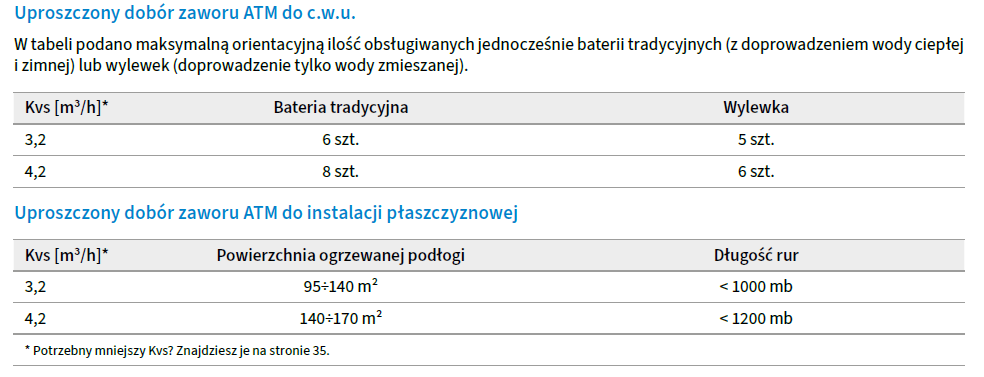 Należy pamiętać, że przeliczenie długości rur na typowe odpowiadające im powierzchnie podłogi jest kolejnym dużym uproszczeniem, a co za tym idzie dobór wg powyższej tabeli powinien być dokonywany w pierwszej kolejności na podstawie długości rur. Wybór zaworu ATM na podstawie powierzchni podłogi powinien być wykonywany jedynie, gdy nie mamy informacji o długości rur. Wynika to z uśrednień typowych rozstawów rur oraz lokalnych zagęszczeń w instalacjach ogrzewania podłogowego.