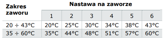 Ze względu na temperatury pracy instalacji ogrzewania podłogowego zalecamy termostatyczne zawory mieszające ATM z zakresami regulacji temperatury 20 ÷ 43°C. Utrzymywanie teperatury zasilania instalacji ogrzewania podłogowego w tym zakresie ma kluczowe znaczenie dla optymalnego komfortu użytkowników z punktu widzenia fizjologii człowieka. Dlatego nie zaleca się zwiększania maksymalnych temperatur zasilania powyżej 38°C (nastawa "5" na zaworze ATM).