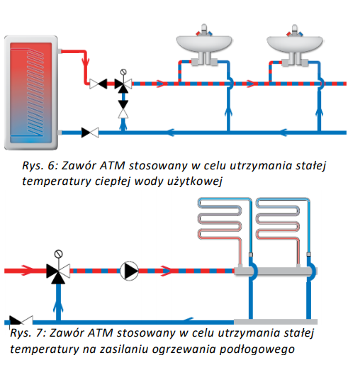Termostatyczne zawory mieszające ATM, za zadanie mają utrzymanie stałej temperatury na zasilaniu. Jeżeli w punkcie centralnym chcemy regulować temperaturą wody w każdym z punktów poboru, wówczas montujemy zawór ATM tuż za zasobnikiem c.w.u.