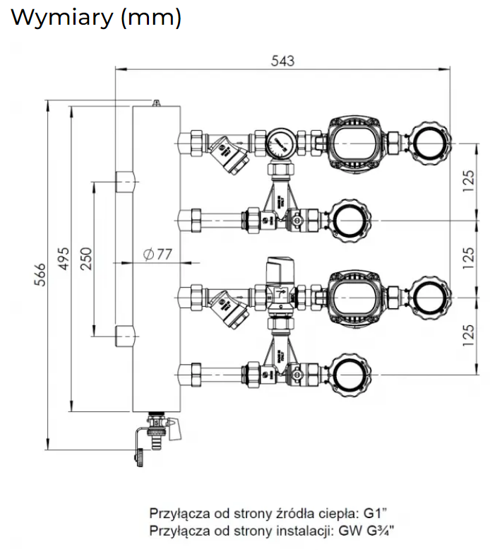 - Zawory odcinające ze zintegrowanymi termometrami do kontroli temperatury medium na każdym przyłączu.