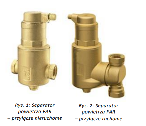 Separatory powietrza FAR montowane są na zasilaniu instalacji centralnego ogrzewania lub powrocie instalacji chłodniczych celem usuwania rozpuszczonego w medium grzewczym/chłodniczym powietrza. Separatory FAR wspomagają uwalnianie się powietrza z medium, a następnie usuwają je poprzez zintegrowany odpowietrznik automatyczny. Separatory z przyłączem ruchomym mogą być instalowane zarówno na przewodach poziomych jak i pionowych.