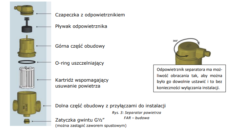 Separatory powietrza FAR montowane są na zasilaniu instalacji centralnego ogrzewania lub powrocie instalacji chłodniczych celem usuwania rozpuszczonego w medium grzewczym/chłodniczym powietrza. Separatory FAR wspomagają uwalnianie się powietrza z medium, a następnie usuwają je poprzez zintegrowany odpowietrznik automatyczny.