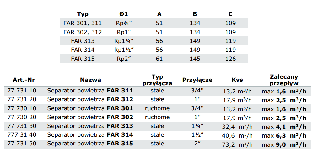 Separatory powietrza FAR montowane są na zasilaniu instalacji centralnego ogrzewania lub powrocie instalacji chłodniczych celem usuwania rozpuszczonego w medium grzewczym/chłodniczym powietrza. Separatory FAR wspomagają uwalnianie się powietrza z medium, a następnie usuwają je poprzez zintegrowany odpowietrznik automatyczny. Separatory z przyłączem ruchomym mogą być instalowane zarówno na przewodach poziomych jak i pionowych.