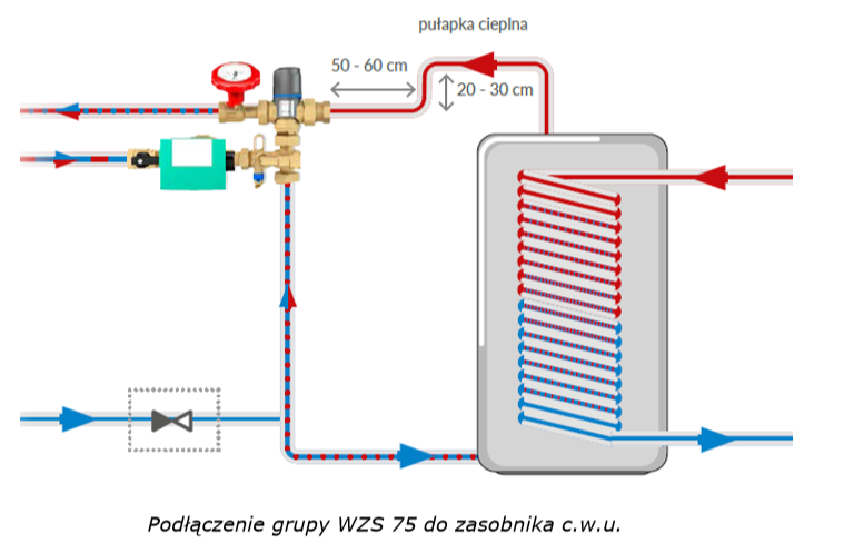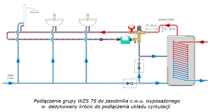 Grupy pompowe WZS przeznaczone są do szybkiego, wygodnego i optymalnego wykonania układu cyrkulacji ciepłej wody użytkowej przy zasobniku c.w.u.. Przemyślana kompaktowa konstrukcja grup minimalizuje ryzyko niepoprawnego wykonania instalacji c.w.u.. Grupy WZS zaprojektowane zostały do montażu zarówno z zasobnikami c.w.u. wyposażonymi w dedykowany króciec cyrkulacyjny, jak i bez niego. Wszystkie grupy WZS są fabrycznie sprawdzane pod kątem szczelności. Wyposażone zostały w energooszczędną pompę cyrkulacyjną WILO (max 5 W) oraz termostatyczny zawór mieszający ATM (35÷60°C) z funkcją zabezpieczającą przed poparzeniem.
