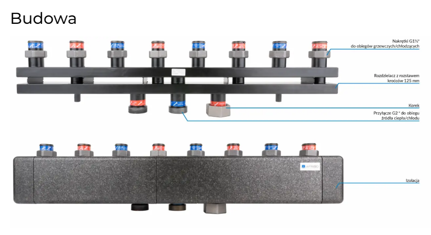 • Cztery pary przyłączy zasilających i powrotnych obiegów pompowych.