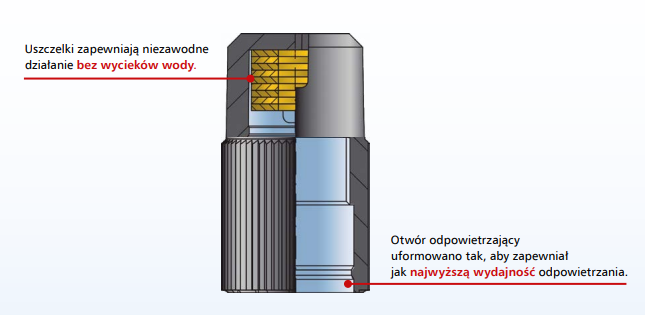 W najnowszej odsłonie odpowietrznik automatyczny został wyposażony w system Aquastop dodatkowo zabezpieczający przed wyciekiem wody z instalacji w wypadku, gdyby otwór wentylacyjny odpowietrznika stracił szczelność, np. wskutek zabrudzenia. System Aquastop zbudowany jest ze specjalnych uszczelek, które w wyniku nasiąknięcia wodą z potencjalnego wycieku zwiększają swoją objętość. Skutkuje to zamknięciem zaworu powietrznego odpowietrznika, zanim dojdzie do wydostania się wody. Nowa, ulepszona konstrukcja zapewnia pewniejsze oraz szybsze odpowietrzanie. Dodatkowo zwiększona została odporność na drobne zabrudzenia, które mogą znajdować się w instalacji.