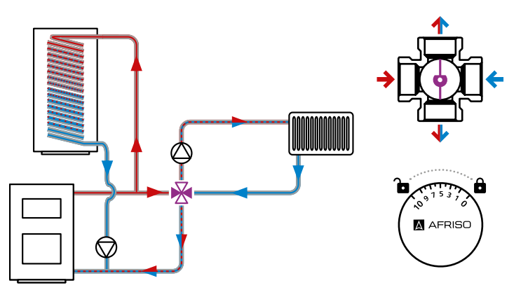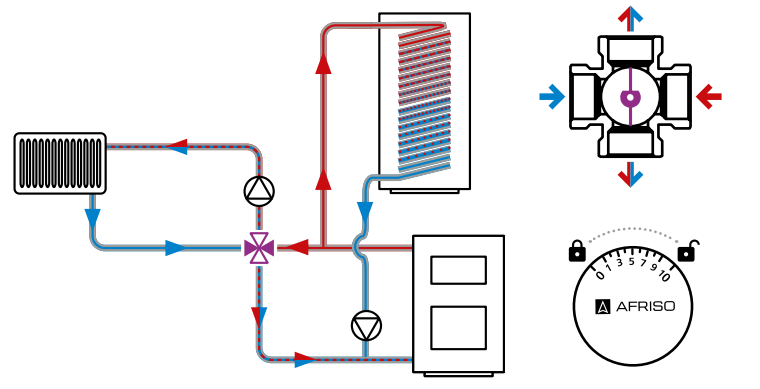 - Miesza w odpowiednich proporcjach strumienie czynnika wypływającego na instalację i powracającego do kotła.