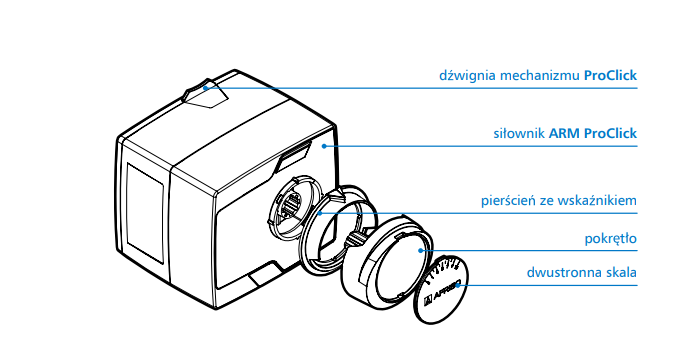 - Diody siłownika ARM ProClick informują o aktualnym kierunku obrotu zawieradła zaworu.