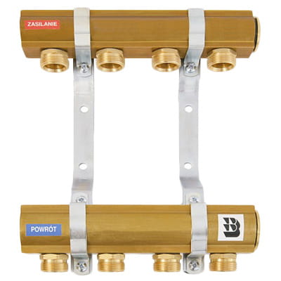 Rozdzielacz mosiężny 1" z nyplami 1/2" x 3/4", 4 obwody.