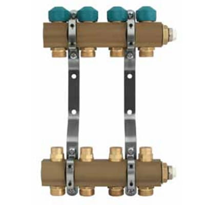 Rozdzielacz mosiężny 1” z wkładkami termostatycznymi i zaworami odcinającymi, 6 obwodów.