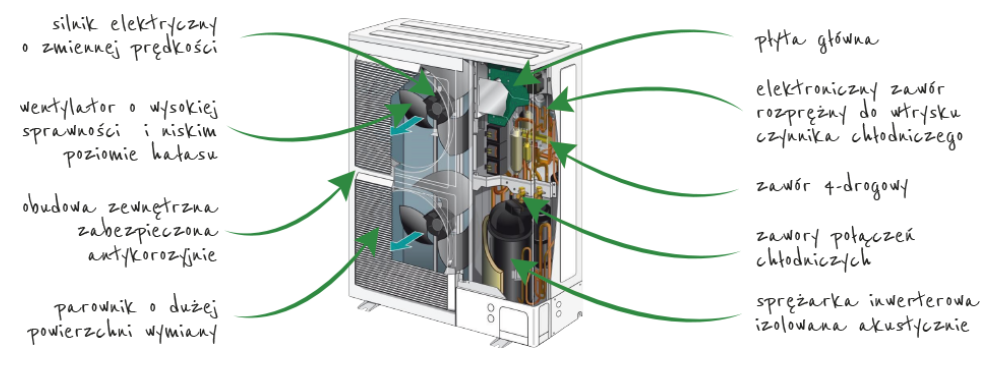 Dzięki najnowocześniejszym rozwiązaniom technicznym zewnętrzny moduł charakteryzuje bardzo cicha praca, generująca hałas na poziomie około 40 dB.