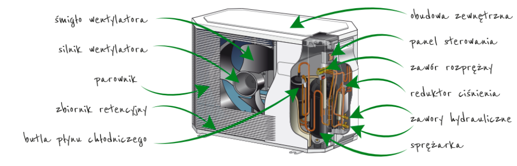 Moduł ten montowany jest na zewnątrz budynku. Składa się on z wentylatora, sprężarki, parownika oraz zaworu rozprężnego.