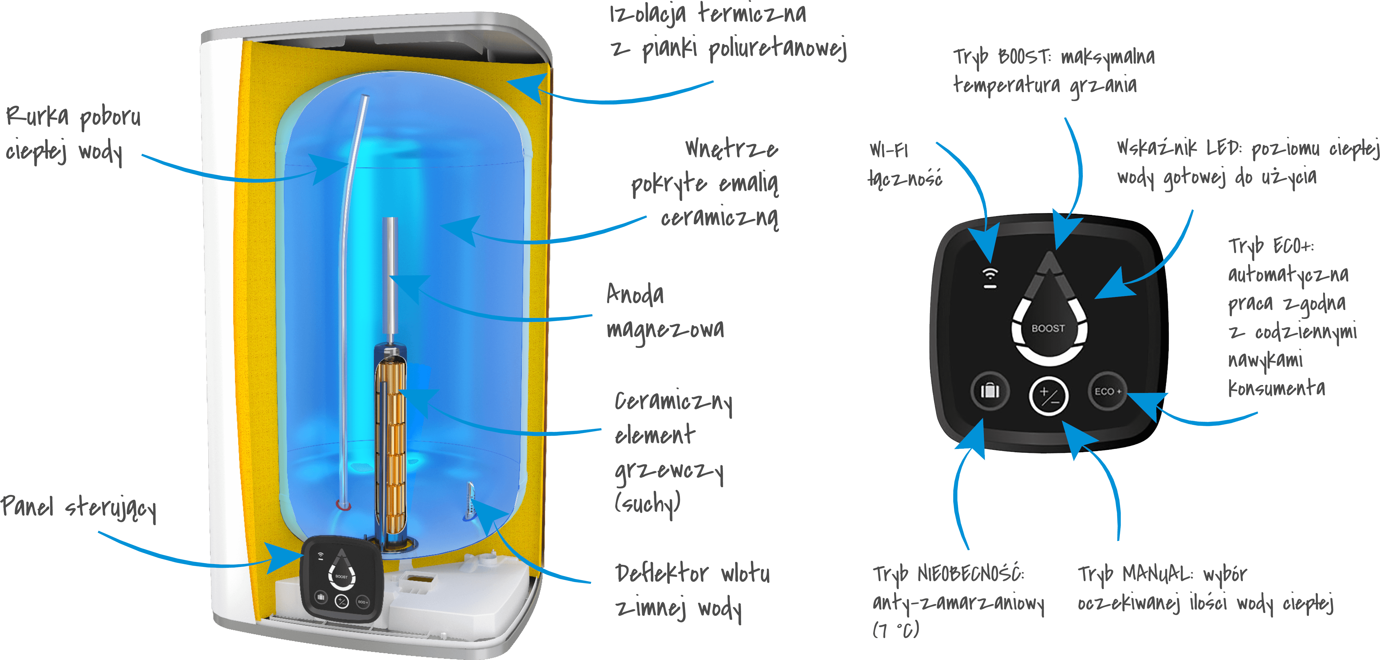 - tryb przyspieszonej pracy BOOST (dodatkowy prysznic w mniej niż 30 min)