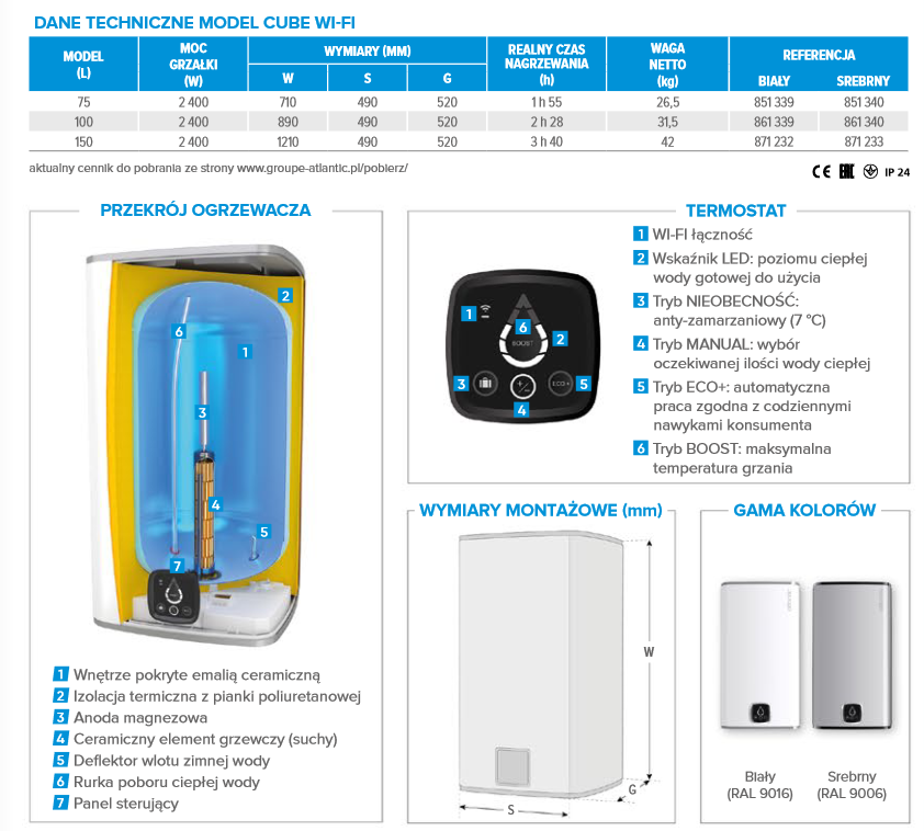 ATLANTIC OGRZEWACZ WODY CUBE-2 WiFi 75L 2,4 KW WISZĄCY PIONOWO 851339