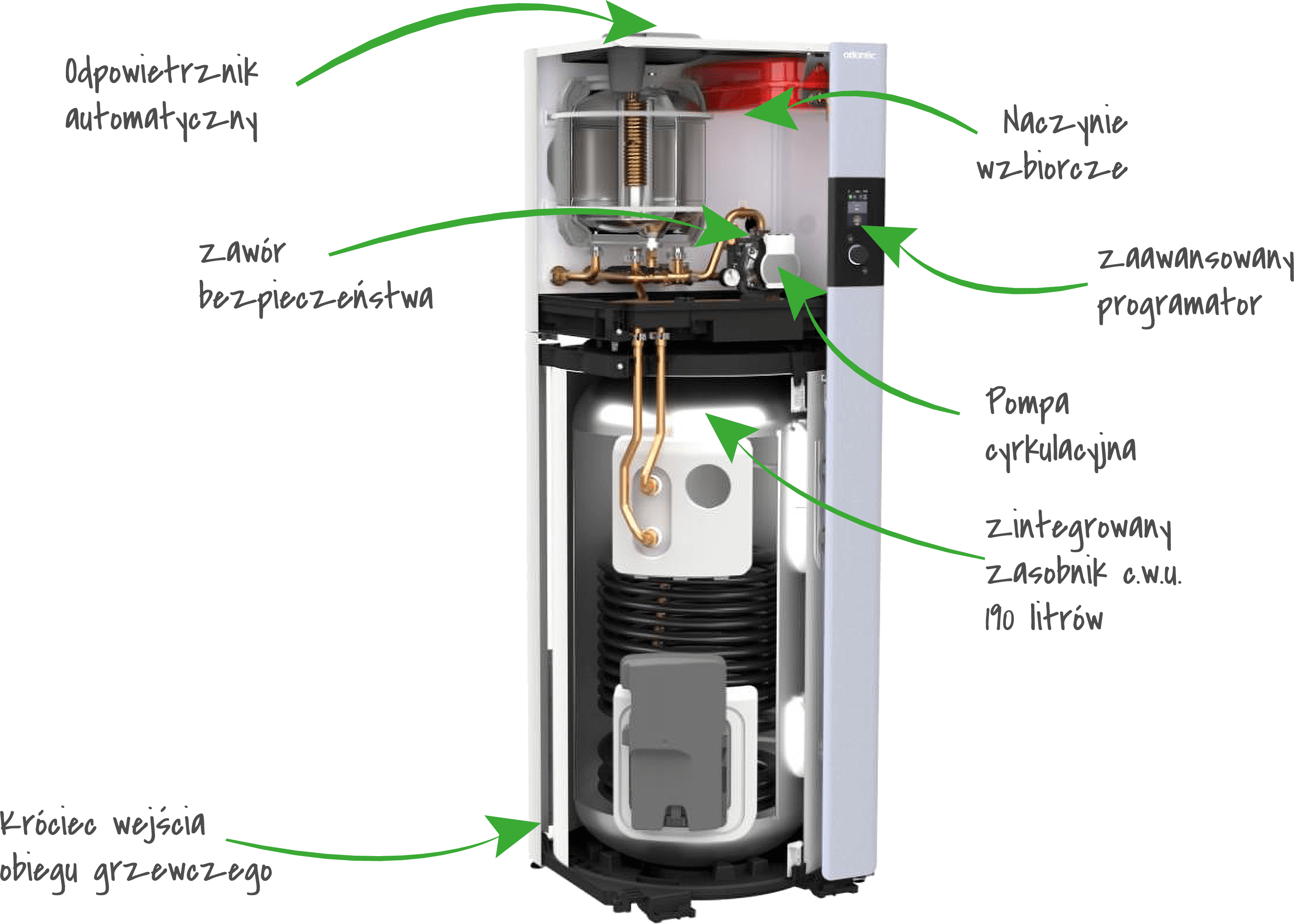 • Zintegrowany zbiornik ciepłej wody użytkowej o pojemności 190 litrów