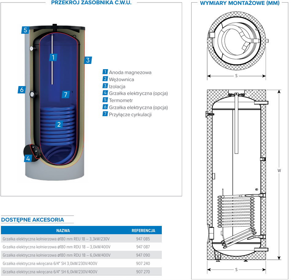 Możliwość montażu grzałki elektrycznej 6/4”, co pozwala rozszerzyć funkcjonalność urządzenia lub wykorzystać je w taryfie nocnej.
