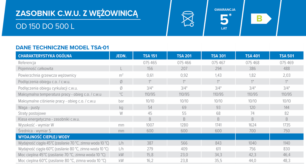 TSA-01 to zasobnik c.w.u., który łączy wydajność, trwałość i ponadprzeciętny komfort pracy. Dzięki nowoczesnej technologii, wysokiej jakości wykonania oraz możliwości współpracy z różnymi źródłami ciepła, model TSA-01 sprawdzi się w każdym domu, zapewniając stabilne i ekonomiczne przygotowanie ciepłej wody.