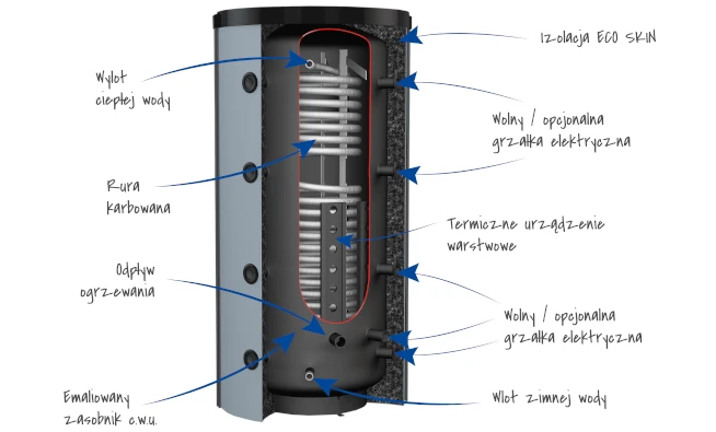 W celu maksymalizacji efektu izolacji termicznej, zastosowaliśmy nowoczesny system ECO SKIN 2.0 w naszych zbiornikach buforowych KWS. Ten system zapewnia wysoką klasę efektywności energetycznej, co przekłada się na oszczędność energii i redukcję kosztów.