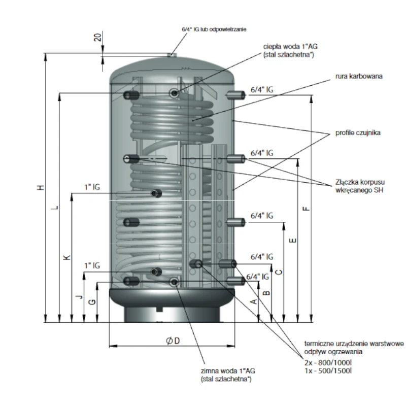 Zbiornik buforowy KWS to rozwiązanie, które umożliwia wykorzystanie bufora jako efektywnego magazynu ciepła oraz podgrzewu ciepłej wody przy użyciu karbowanej wężownicy ze stali nierdzewnej. Ten innowacyjny system zapewnia niezawodne i wydajne dostarczanie ciepłej wody użytkowej.