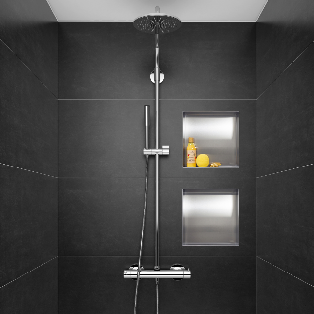 Półki wnękowe WALL-BOX No Rim pozwalają uporządkować przestrzeń w łazience i nadają jej nowoczesnego designu. Na łatwo dostępnych półkach można ustawić kosmetyki, perfumy a w kabinie prysznicowej – szampony, żele i inne artykuły kąpielowe.