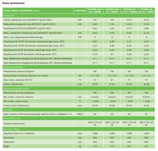 - Pompy ciepła o najwyższej klasie energetycznej A+++ dla temp. zasilania 55℃; model 2-6 w klasie A++;