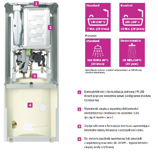 Komfortowa wydajność ciepłej wody dzięki zintegrowanemu zasobnikowi i podwyższonej mocy