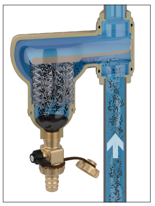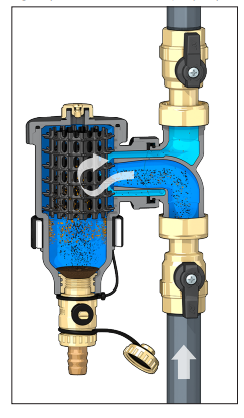 Zasada działania separatora zanieczyszczeń opiera się na połączeniu wielu zjawisk fizycznych. Wewnętrzny element (1) składa się z szeregu siatkowych powierzchni. Zanieczyszczenia zderzając się z powierzchnią elementu wewnętrznego są separowane z wody i opadają do dolnej części korpusu (2), gdzie są gromadzone. Zanieczyszczenia ferromagnetyczne wychwytywane są za pomocą silnego pola magnetycznego wytwarzanego przez magnesy umieszczone w specjalnym zewnętrznym pierścieniu (3). Duża objętość wewnętrzna urządzenia powoduje zmniejszenie prędkości przepływającej wody, co wspomaga separację zanieczyszczeń. Usuwanie zgromadzonych zanieczyszczeń można przeprowadzić przy normalnej pracy instalacji, w tym celu należy otworzyć zawór (4) znajdujący się w dolnej części urządzenia.