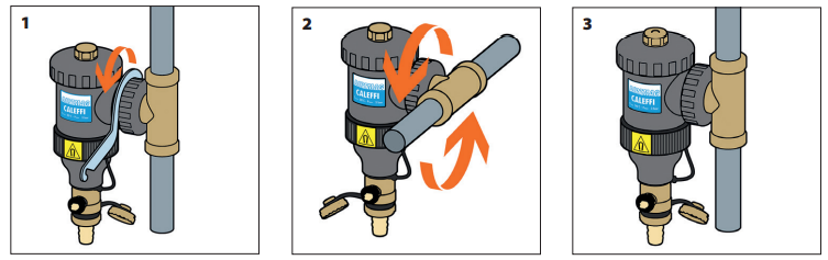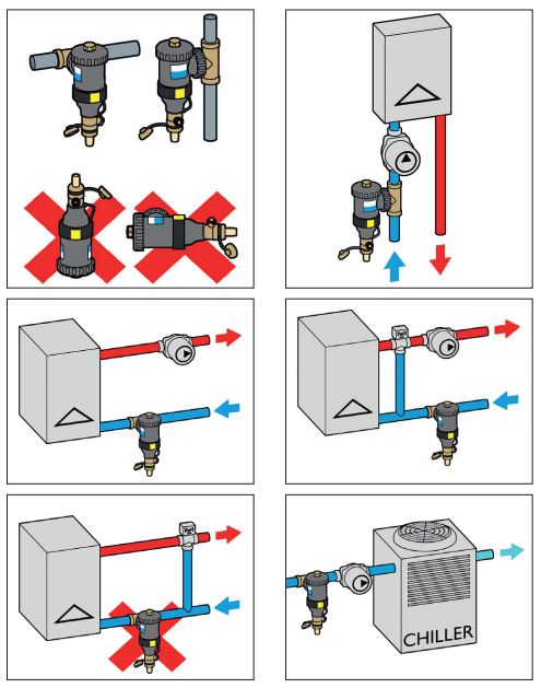 Urządzenie należy instalować zgodnie z kierunkiem przepływu oznaczonym strzałką, na rurociągu powrotnym przed źródłem ciepła/chłodu, najlepiej po stronie ssącej pompy. Korpus musi znajdować się w pozycji pionowej, skierowany śrubą odpowietrzającą ku górze.
