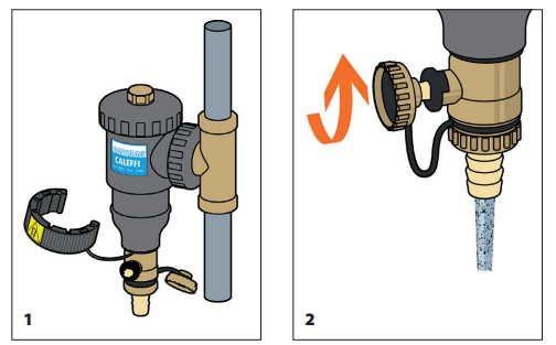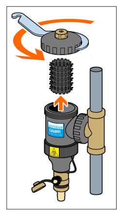 Zdjąć pierścień magnetyczny (1) i opróżnić komorę zanieczyszczeń otwierając zawór spustowy za pomocą dołączonego klucza (2). Czynność może być wykonana w trakcie normalnej pracy instalacji