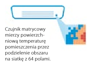 - Czujnik matrycowy po określeniu aktualnej temperatury w pomieszczeniu, rozprowadza powietrze równomiernie w całym obszarze, zanim przełączy się na tryb przepływu powietrza ciepłego lub zimnego, w zależności od zapotrzebowania.
