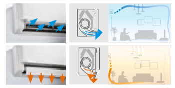 Efekt Coandy tworzy dwa różne schematy przepływu powietrza w zależności od trybu – chłodzenie lub grzanie. Górny obrazek wskazuje efekt chłodzenia (stumień powietrza w suficie), dolna ilustracja pokazuje efekt Coandy w trybie ogrzewania (pionowy przepływ powietrza).