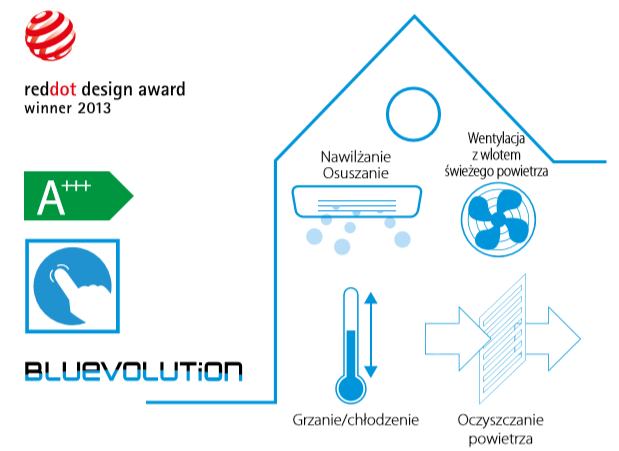 - Unikalne połączenie nawilżania, osuszania, wentylacji świeżego powietrza, oczyszczania powietrza oraz ogrzewania i chłodzenia w 1 systemie