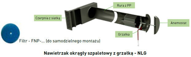 Nawietrzak szpaletowy z grzałką to urządzenie, którego zadaniem jest skuteczne doprowadzenie powietrza do wnętrza budynku, wstępnie je podgrzewając. Pracą grzałki steruje termostat, który włącza ją przy spadku temperatury poniżej 3°C, a wyłącza przy wzroście temperatury ok 10-15°C. Pobór mocy urządzenia grzewczego jest uzależniony od ilości i temperatury wlatującego powietrza. Podobnie do wersji standardowej, nawietrzak z grzałką może być opcjonalnie doposażony w stabilizator przepływu.
