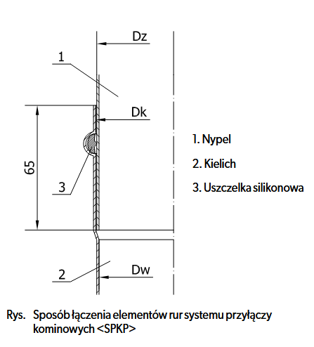 Poszczególne elementy systemu kominowego łączone są przez włożenie jednej części elementu - nypla, w drugą roztłoczoną część elementu - kielicha. Dzięki połączeniu kielichowemu otrzymujemy szczelną i sztywną konstrukcję przyłącza. Sposób łączenia elementów umożliwia prawidłowy spływ ewentualnych skroplin po ściankach elementów przyłącza do miski. Zastosowanie uszczelki z gumy silikonowej, znajdującej się w przetłoczeniu kielicha, zapewnia szczelność systemu przy nadciśnieniu spalin 200Pa. Elementy są malowane proszkowo farbą wysokotemperaturową (do 400°C) na kolor czarny.