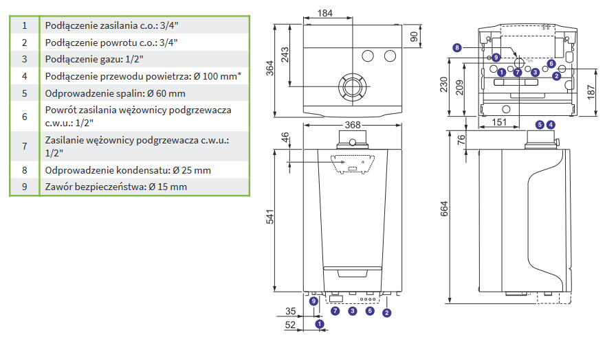 - Naścienny gazowy kocioł kondensacyjny wstępnie wyregulowany fabrycznie
