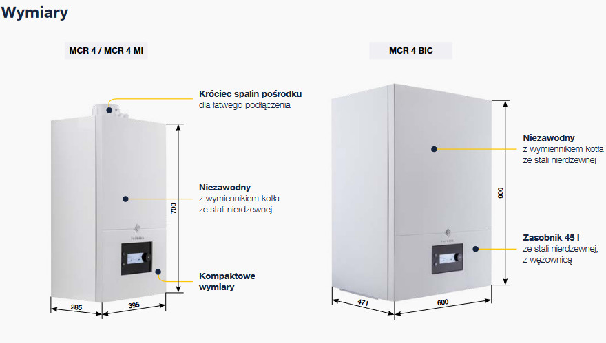 - Kocioł o bardzo zwartej konstrukcji 395 x 700 x 285 mm oraz lekki 28,5 kg