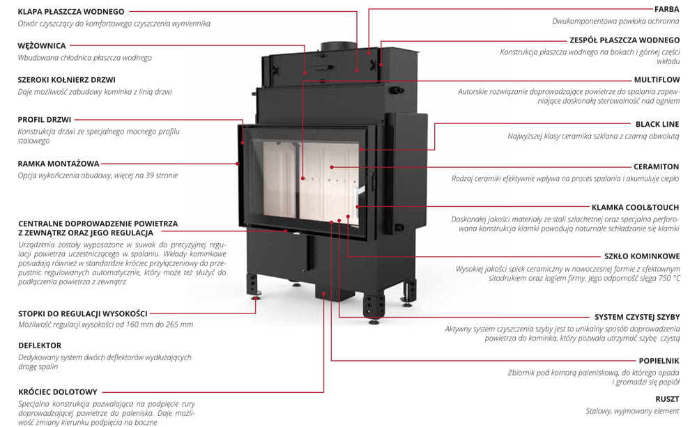 | Wyposażenie | - nawiew powietrza na szybę - wymienna tylna płyta - ogranicznik drewna - ruszt uszczelka z pamięcią kształtu |