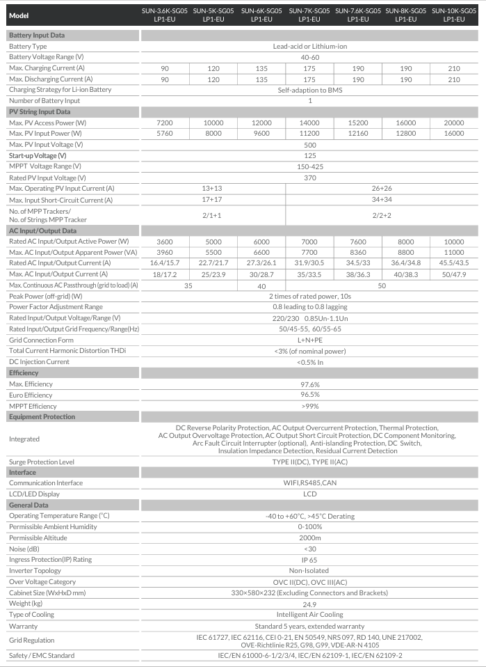 Falownik wyróżnia się wysoką sprawnością (do 97,6%) oraz elastycznością konfiguracji. Dwa niezależne MPPT (Maximum Power Point Tracking) pozwalają na podłączenie paneli fotowoltaicznych o różnej orientacji i mocy, co ułatwia optymalizację instalacji. Możliwość współpracy z różnymi typami akumulatorów (litowo-jonowe, AGM, żelowe) daje swobodę w doborze magazynu energii.