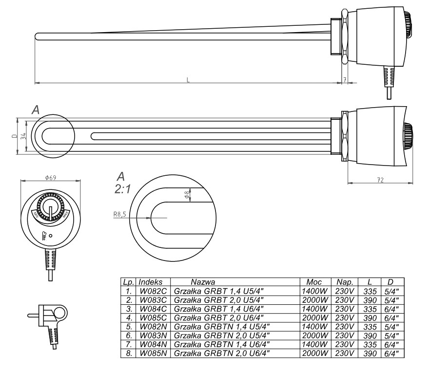 - Termostat: bimetalowy 20°C - 80°C z zabezpieczeniem STB 90°C
