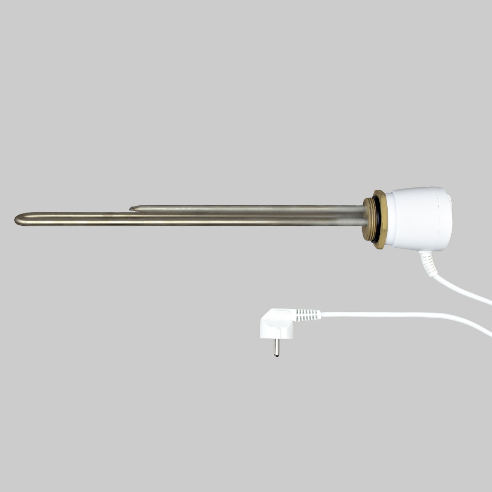 Elementy grzejne (grzałki) z termostatem przeznaczone do bojlerów, wykonane z rurki AISI316L i kołnierza mosiężnego.