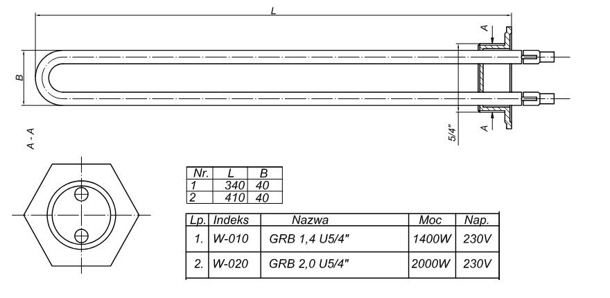 ELIKO GRZAŁKA RURKOWA GRB W KSZTAŁCIE "U" 1,6 KW 230 V 5/4" W012B