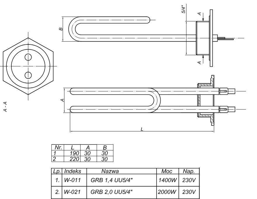 ELIKO GRZAŁKA RURKOWA GRB W KSZTAŁCIE "UU" 1,6 KW 230 V 5/4"