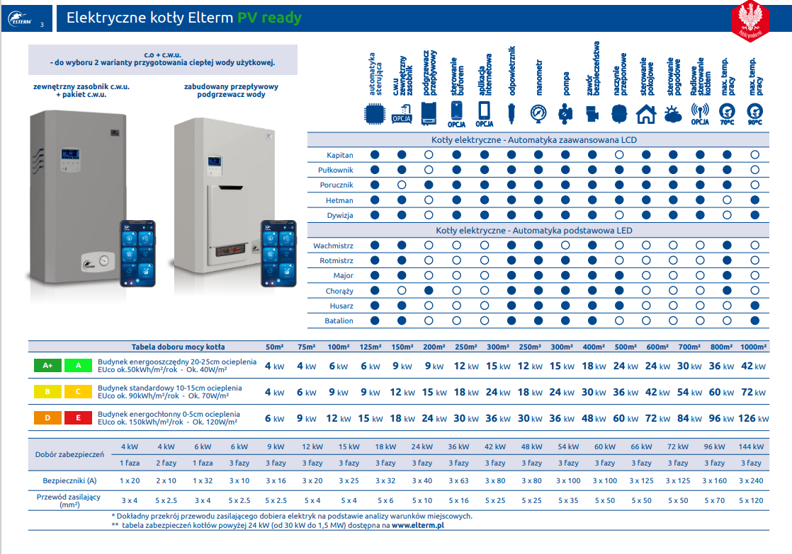Poniższa tabela przedstawia typoszereg kotłów ELTERM serii LED i LCD, z najważniejszymi jego funkcjami: