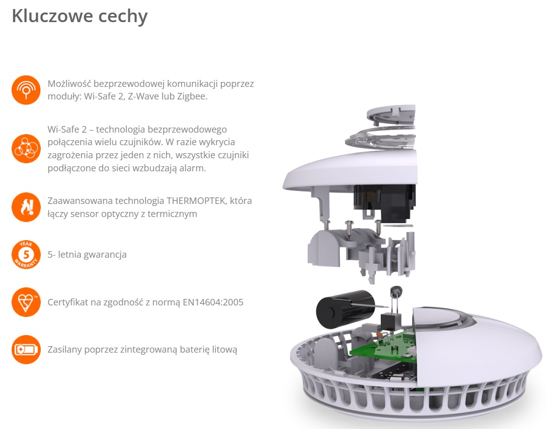 FireAngel ST-630-INT to najwyższej klasy czujnik dymu z technologią THERMOPTEK, wyposażony w możliwość bezprzewodowej komunikacji. Dzięki wykorzystaniu dodatkowych modułów, urządzenie można zintegrować w ramach sieci Wi-Safe2 lub systemami inteligentnego domu Z-Wave oraz Zigbee. W ramach systemu Wi-Safe2 wszystkie podłączone do sieci czujniki reagują jednocześnie na zaistniałe zagrożenie podnosząc bezpieczeństwo użytkowników. Urządzenie posiada zaawansowaną technologią THERMOPTEK, która łączy zalety sensorów optycznych z termicznymi. Dzięki temu, zwiększa się czułość urządzenia oraz niemal dwukrotnie skraca czas reakcji na źródło dymu. Urządzenie posiada przycisk test/reset a także sygnalizację słabej baterii oraz końca swej żywotności. Czujnik dymu ST-630-INT zasilany jest poprzez zintegrowaną baterię litową, która nie wymaga wymiany ani ładowania przez cały okres użytkowania. Potwierdzeniem najwyższego poziomu bezpieczeństwa jest m. in. certyfikat zgodności z normą EN14604. Czujnik dymu FireAngel ST-630 posiada 5 lat gwarancji.