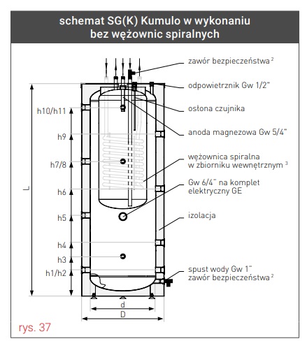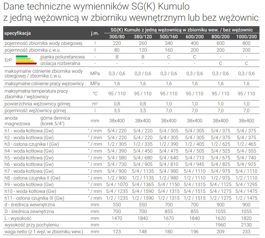 Kumulo oznacza kumulację. Kumulację energii pochodzącej z różnych źródeł i możliwości jej wykorzy-stania. Górny, mniejszy zbiornik stanowi źródło ciepłej wody użytkowej i jest zanurzony w zbiorniku buforowym zasilającym układ centralnego ogrzewania. Pozwala to na swobodną wymianę energii pomiędzy układami c.o. i c.w.u. Ciepła woda zasilająca obwód centralnego ogrzewania przekazuje ciepło do zbiornika c.w.u., pozwala to na uzyskanie odpowiedniej temperatury wody użytkowej. W dolnej części zbiornika c.o. znajduje się powiększona wężownica spiralna gwarantująca optymalne wykorzystanie mocy kolektorów słonecznych. Zbiornik c.o. ma również możliwość montażu izolowanego, elektrycznego kompletu grzejnego GE z grzałką i termostatem. Instalacja układu trzech czujników pozwala na stały nadzór temperatury systemu ogrzewania c.w.u. i c.o. oraz najwydajniejszy dobór źródeł zasilania. W zależności od potrzeb, układ zasilają tylko kolektory słoneczne lub dodatkowo pompa ciepła lub kocioł c.o. i grzałka elektryczna.
