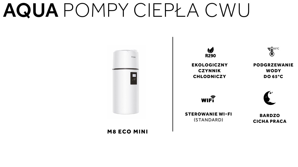 HAIER AQUA M8 ECO MINI POMPA CIEPŁA C.W.U 102 L (bez wężownic; grzałka 1,2kW; R290) HP110M8-9 - AUTORYZOWANY DYSTRYBUTOR !!!