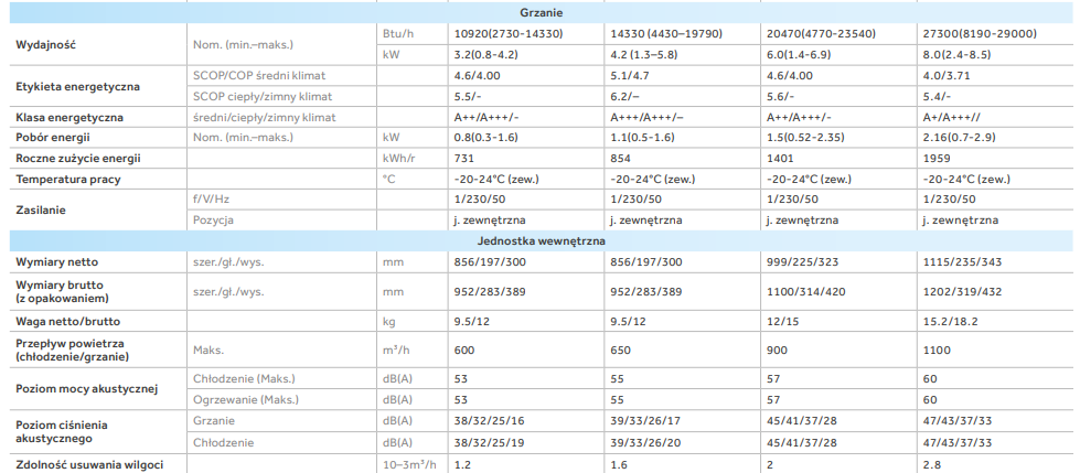 | Poziom ciśnienia akustycznego jednostki wewnętrznej dla chłodzenia min./maks. (dBA) | 19 / 38 |